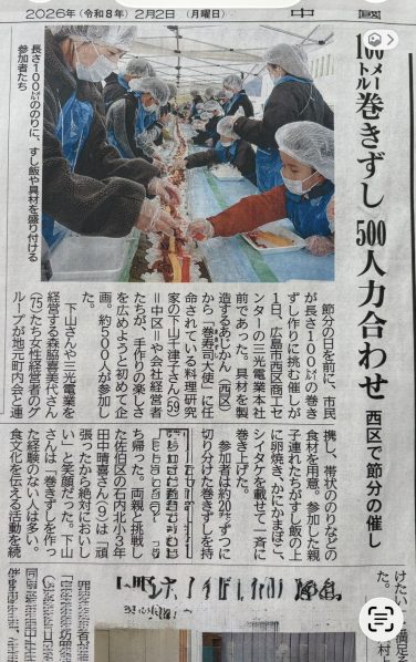 2月1日の100mロング巻き寿司大会が、中国新聞さんに掲載して頂きました。